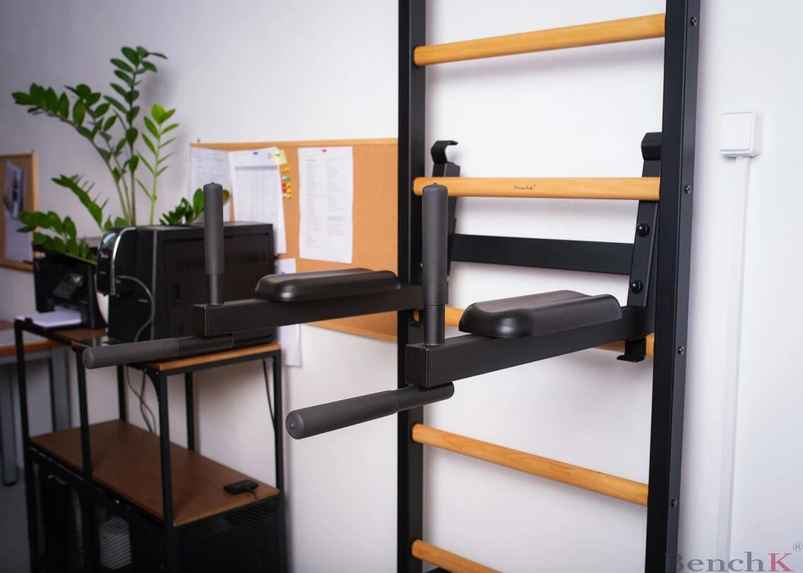 Dip-Bügel als optionales Zubehör für die BenchK-Sprossenwände der Serie 500. Er kann für das Training der Oberarme, des Rumpfes oder für ein Freihanteltraining verwendet werden, bei dem die Hantelstange in den Hantelaufnahmen der Konstruktion abgelegt werden kann.