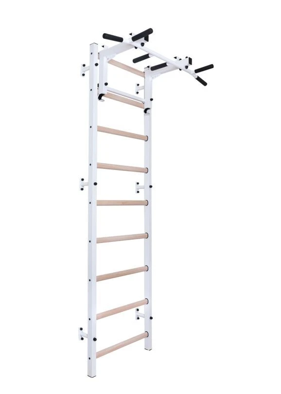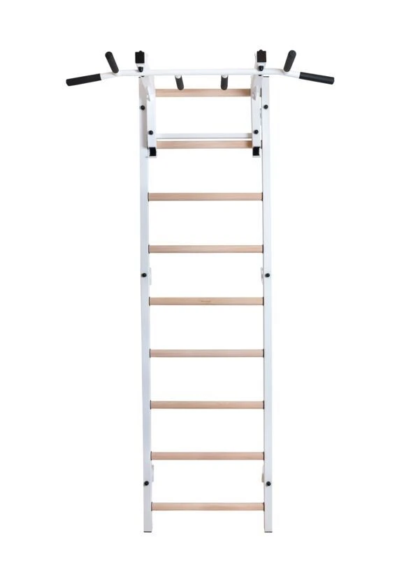 Die BenchK Sprossenwand 711 besteht aus hochwertigen Material und besitzt zusätzlich eine multifunktionelle Klimmzugstange. Die Klimmzugstange kann sowohl für Klimmzüge benutzt werden, wie auch als Hantelstangenhalter (maximale Last 200 kg). Die Sprossenwand entspricht der Norm EN 913 und der Norm EN 12346 und kann entweder an die Wand montiert, oder alternativ an Boden- & Decke befestigt werden. Sie besitzt ein zeitloses und modernes Design, passt somit in jeden Raum und kann mit zusätzlichem Zubehör erweitert werden.