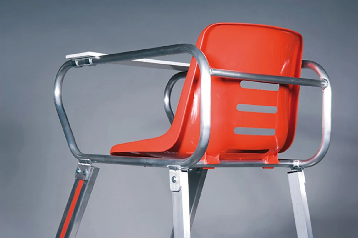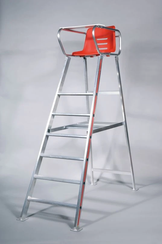 Extra breite wetterfeste Aluminium-Konstruktion, mit rutschsicheren profilierten Stufen. Schalensitz für bequemes Sitzen, klappbarem Schreibbrett und praktischer Mittelablage. Höhe ca. 230 cm, Sitzhöhe ca. 192 cm.