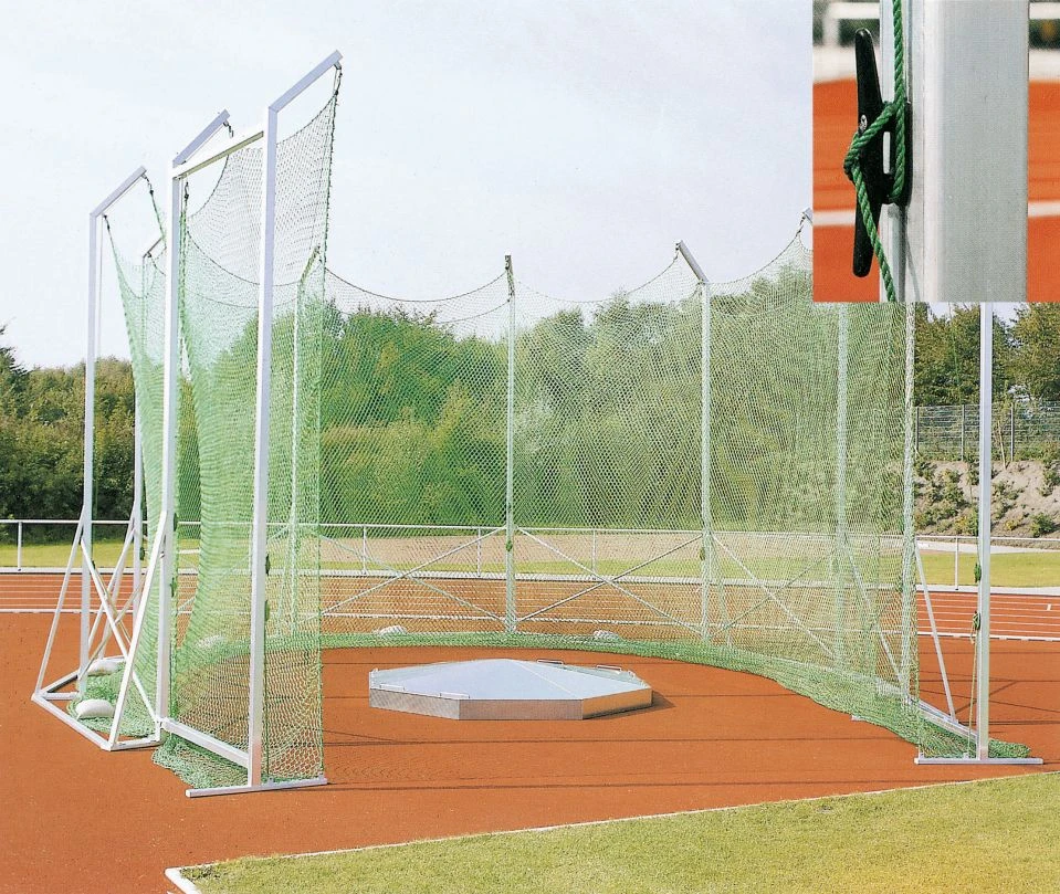 Schutzgitter für Hammerwurf und Diskus. In freistehender Ausführung oder in Bodenhülsen erhältlich. Höhe: 5 auf 5,5 m ansteigend.