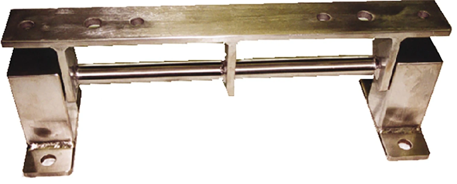 Sprungbrett-Endlager aus korrosionsfreiem V2A-Material. Die Lagerböcke sind mit Kunststoffbuchsen zur Geräuschdämpfung versehen. Alle Verschleißteile sind auswechselbar.