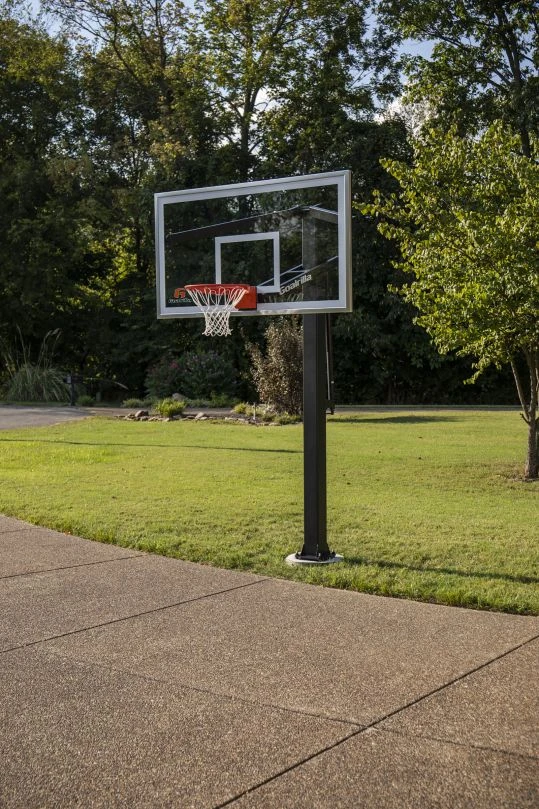 Sehr massive Freizeitanlage aus pulverbeschichtetem Stahl mit komfortabler Höhenverstellung von 2,3 bis 3,05 m! Glaszielbrett 183 x 102 cm, 9,5 mm stark, flexibler Basketballkorb, Säule 15 x 15 cm mit 91 cm Ausladung. Inkl. Montageplatte zum Einbetonieren.