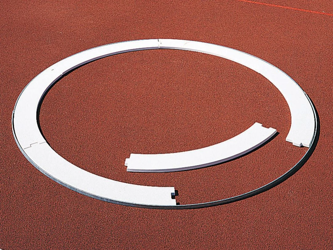Die Segmente werden einfach in den Diskusring (D = 2,5m) eingelegt und verankern sich gegenseitig. Der Ring wird dadurch auf 2,135 m für den Hammerwurf verkleinert.