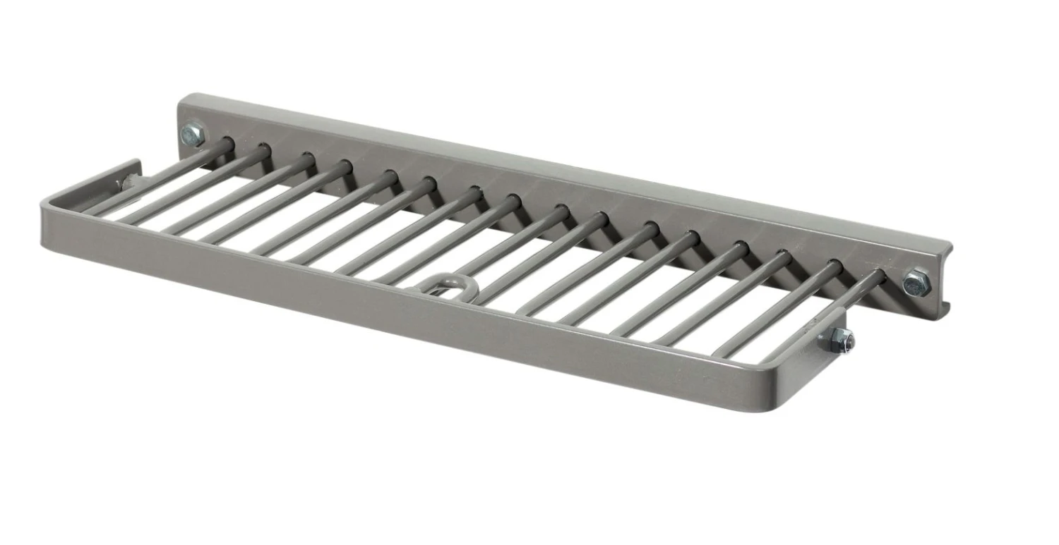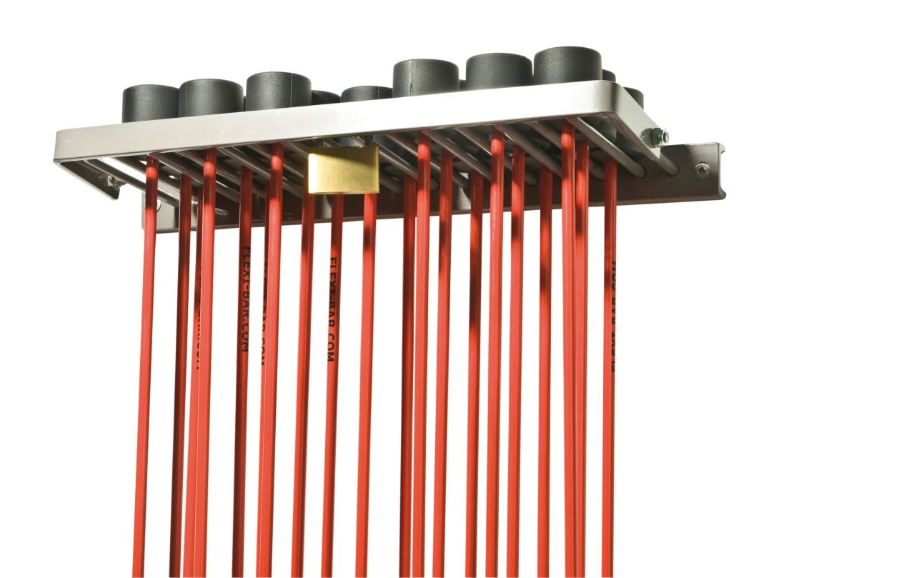Aufhängevorrichtung eignet sich zur optimalen Aufbewahrung von 28 Holz-oder 35 Kunststoffkeulen oder auch 20 Schwingstäben. So sind die Sportgeräte ordentlich und sicher vor unerwünschter Benutzung untergebracht. Mit Hilfe des klappbaren Bügels und einem Vorhängeschloss kann die Aufhängevorrichtung diebstahlsicher verschlossen werden. Stabile Metallkonstruktion zur Wandbefestigung.