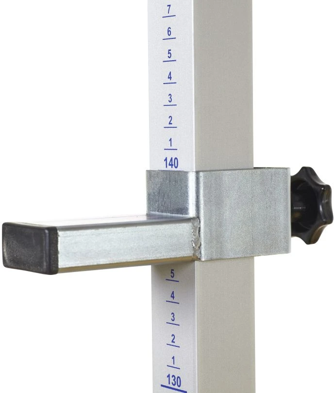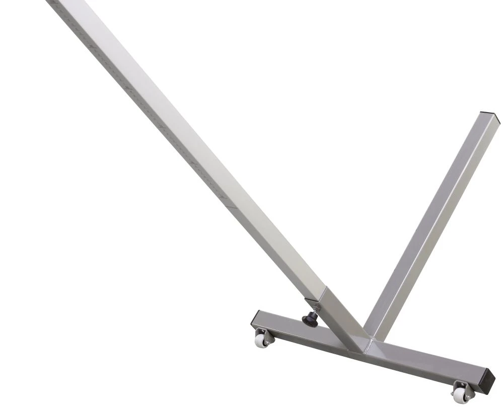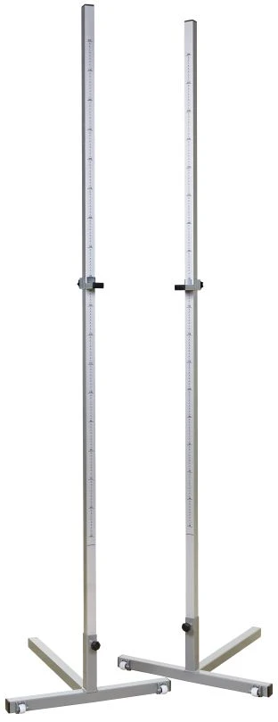 Ein Paar Hochsprungständer bestehend aus je zwei Stahlfüßen, Aluminiumprofilen und Lattenauflegern. Fuß T-förmig, korrosionsbeständig und mit Rollen ausgestattet. Die Aluminiumprofile (35 x 35 mm) sind mit einer Messskala von 50 – 220 cm versehen. Die beiden Lattenaufleger sind pulverbeschichtet.