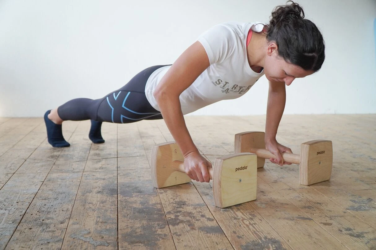 Liegestützgriffe kennen viele Turnerinnen und Turner als Handstandbarren oder Handstandklötze. Einzigartig sind die innovativen Liegestützgriffe von Pedalo dank der vier unterschiedlichen Seiten. Die Seitenwangen haben eine flache und drei unterschiedlich abgerundete Seiten, was die Schwierigkeit erhöht, die Griffe stabil zu halten und gleichzeitig im Liegestütz oder im Handstand darauf zu stehen.