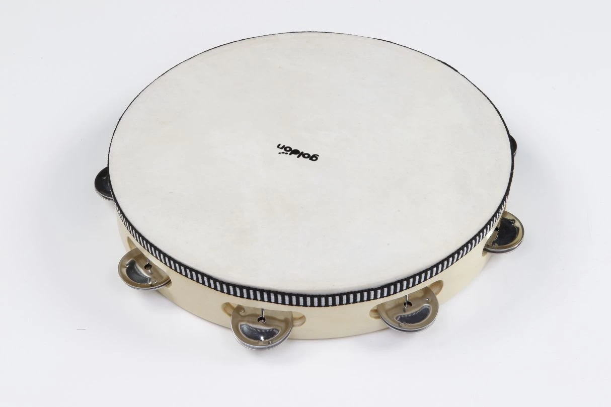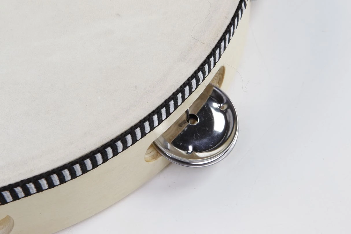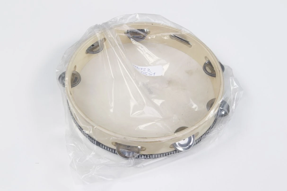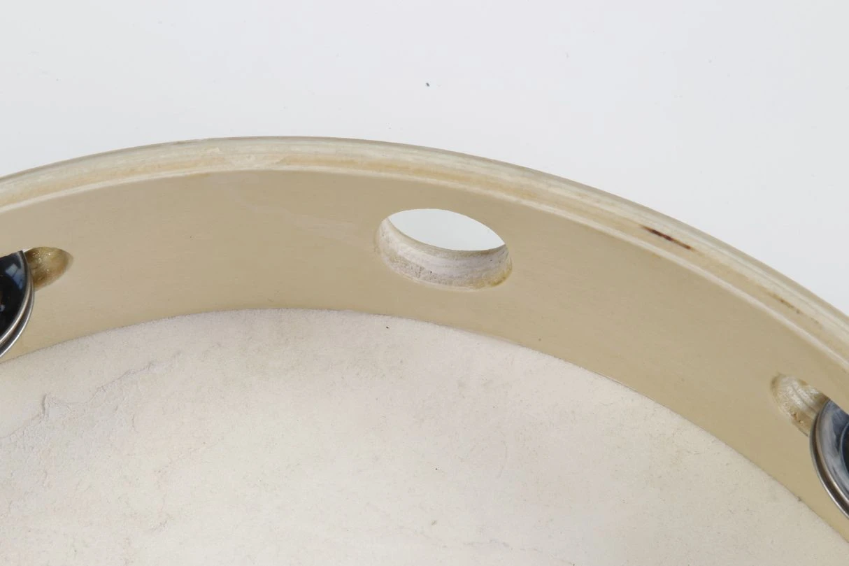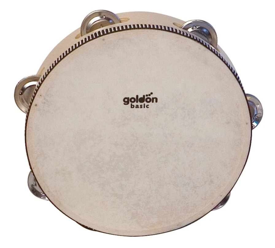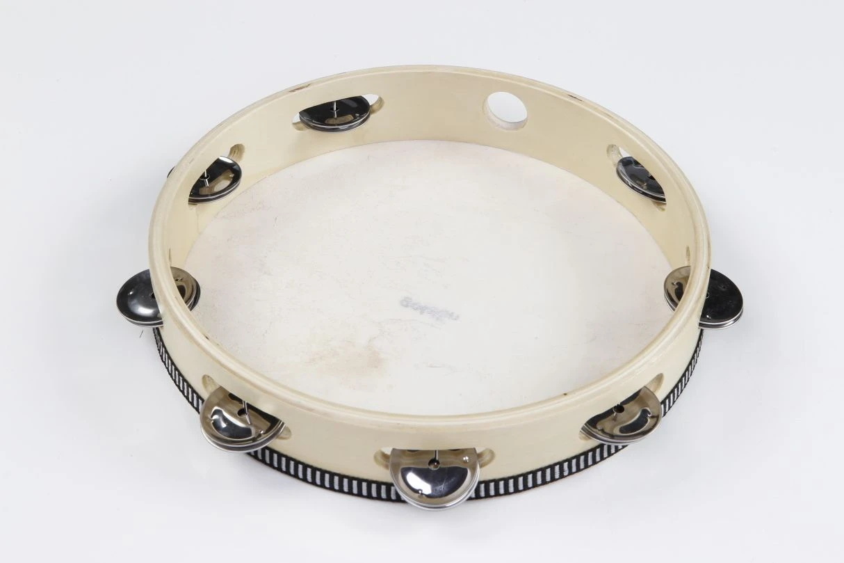 Schellentamburin mit einem Rahmen aus Holz, Naturfellbezug und 8 Paar Schellen. Der Durchmesser des Tamburins beträgt 25 cm.