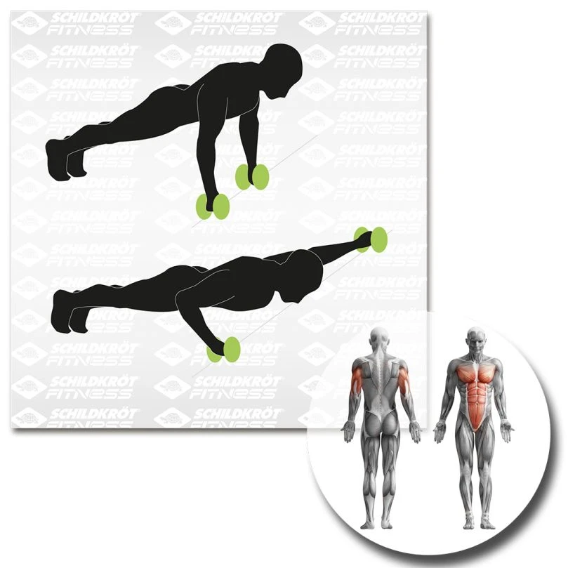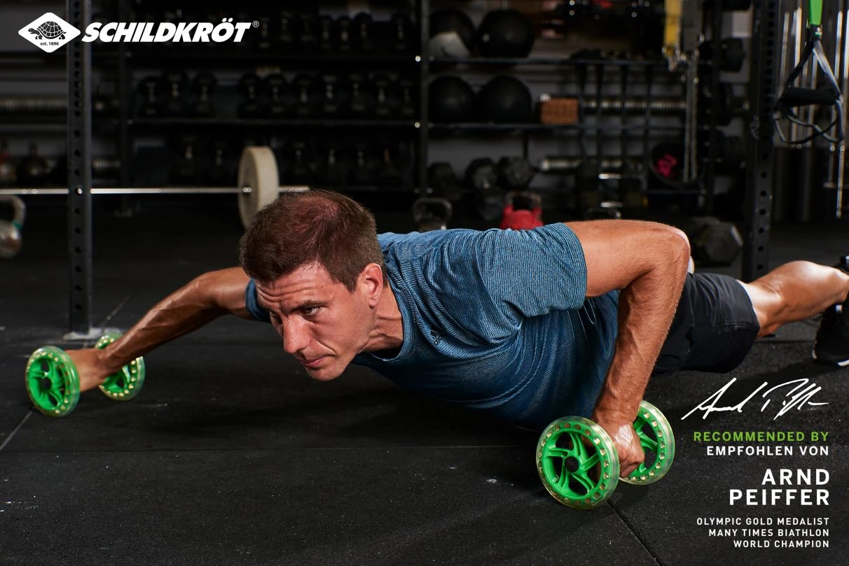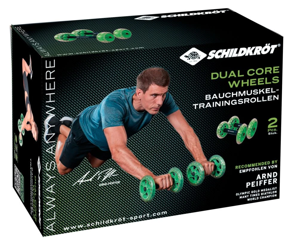 Dual Core Wheels sind der ideale Trainingsbegleiter für das Krafttraining der Rumpfmuskulatur. Laufruhige, kugelgelagerte 145 mm „Non Marking“ Räder ermöglichen ein kombiniertes Training der Bauch-, Rücken-, Arm-, Brust-, und Schultermuskulatur. Die Spurweite von 180 mm und die ergonomisch gestalteten TPE-Handgriffe bieten dabei sicheren Halt.