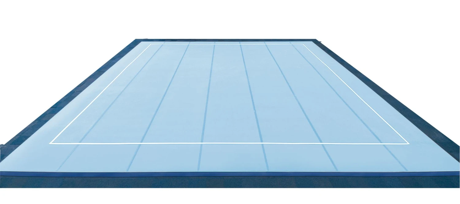 – Auflagefläche: 7 Spezialschaum-Rollmatten mit Nadelvlies Abdeckung je 14 x 2 m x 20 mm und 196 Schaumelemente in Puzzleform (50 mm hoch)