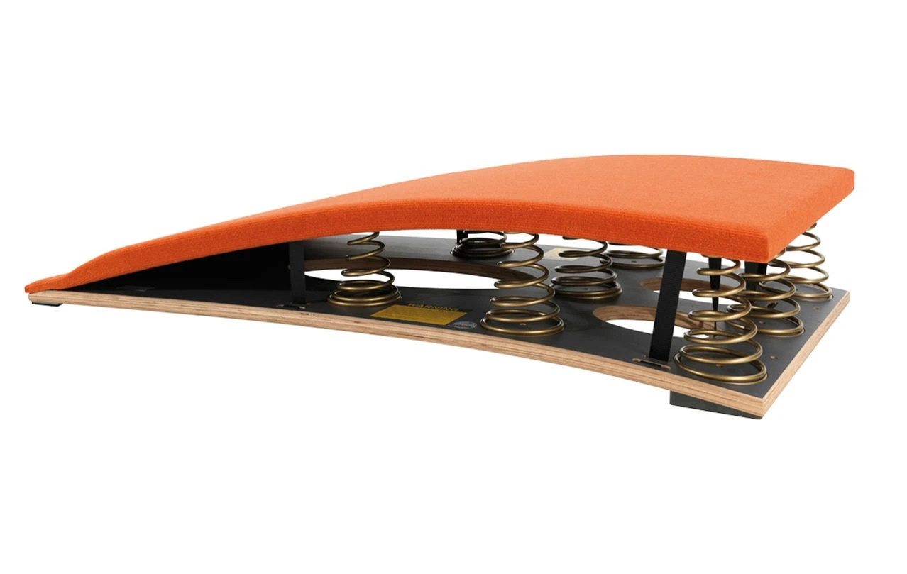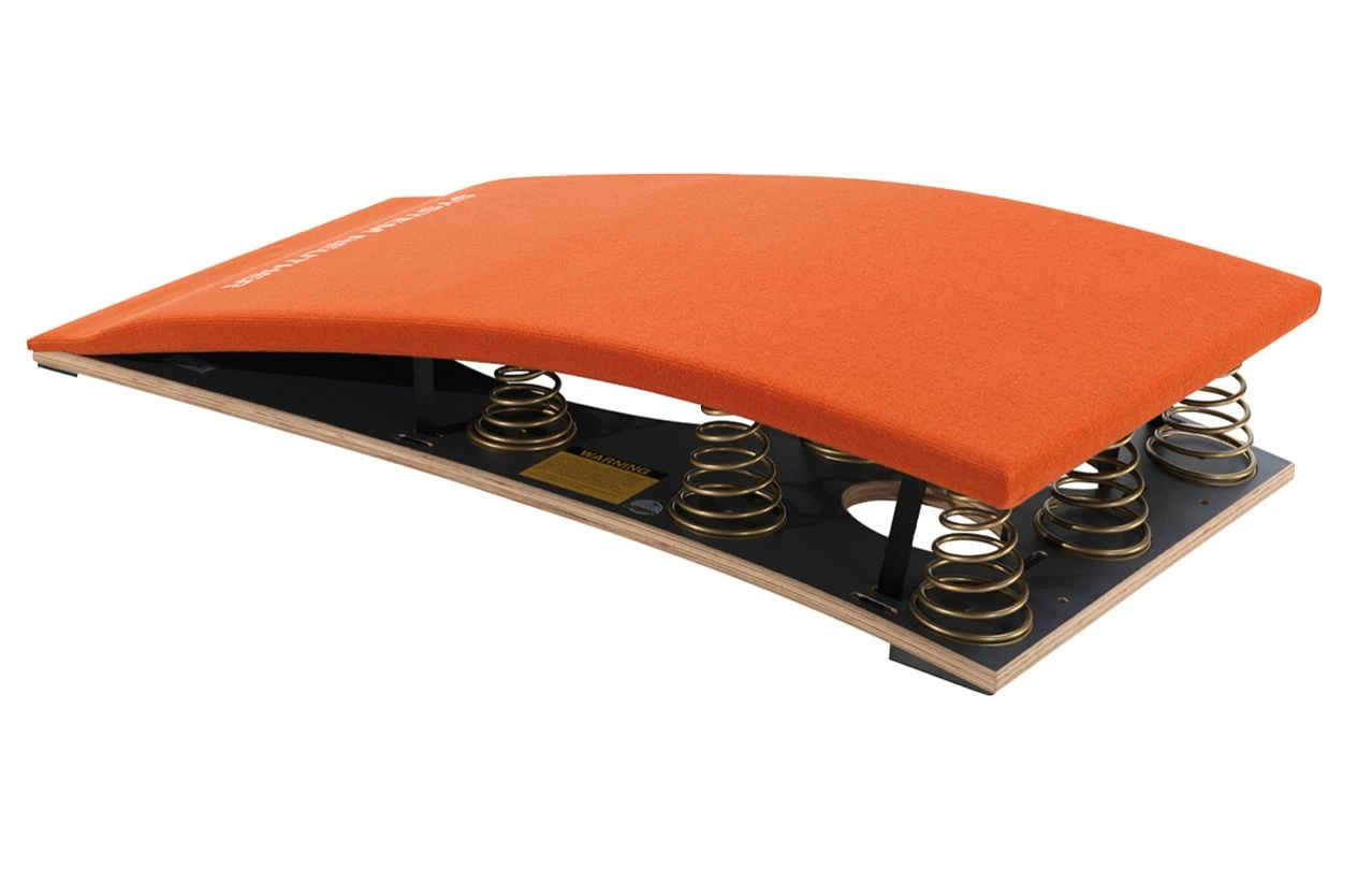 Das FIG zertifizierte Wettkampfsprungbrett Moskau 8 der Marke Spieth Gymnastics mit optimalem Rebound-Effekt über die gesamte Sprungfläche hinweg. Durch punktgenau ausgerichtete, pyramidenförmige und gehärtete Stahlfedern entsteht nahezu kein Energieverlust.
