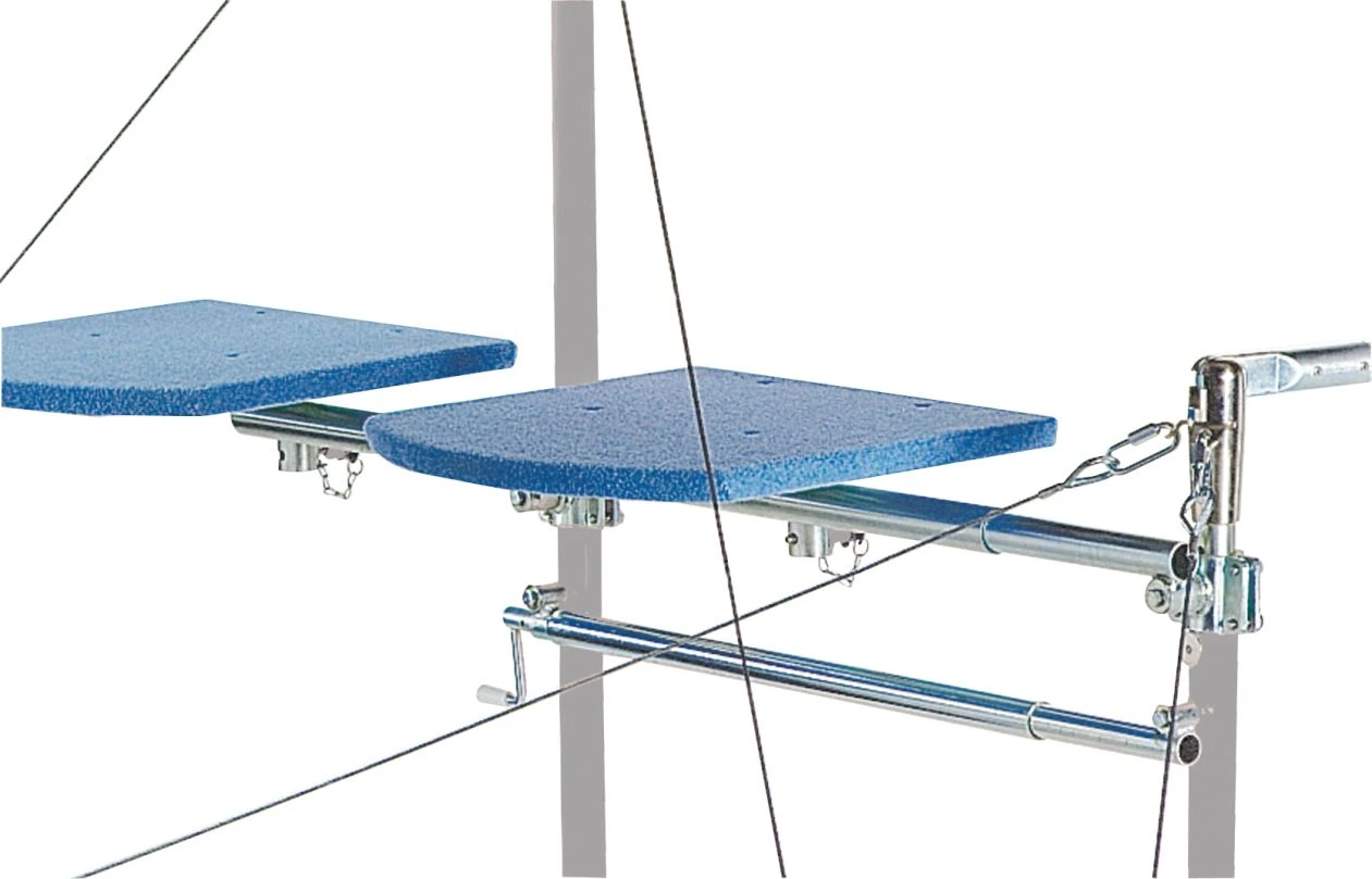 Trainerkonsole für Spieth Gymnastics Wettkampfstufenbarren. Mittels Klemmverschluss wird die Trainerplattform an Säulen oberhalb der Distanzhalterung angeschraubt. Durch Parallelführung bleiben die dreh- und schwenkbaren Plattformen immer waagrecht.