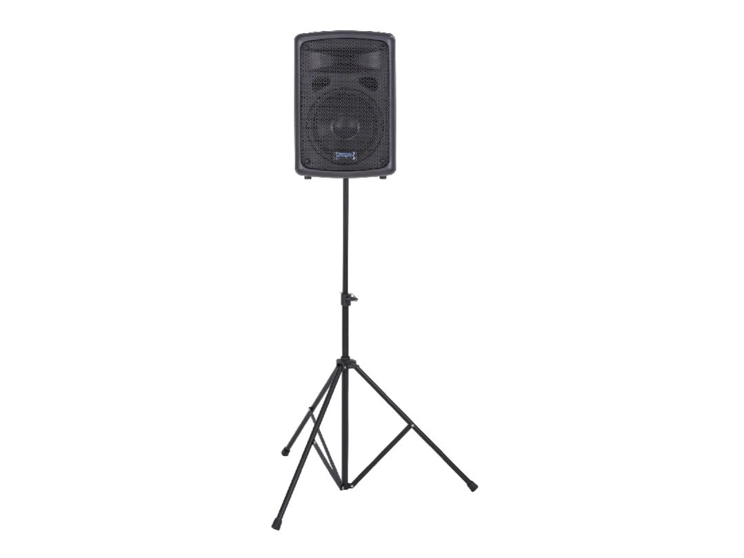 Das Dreibein-Stativ aus robustem Aluminiumgestänge (Ø 1,5 cm) ist von von 75 bis 105 cm höhenverstellbar. Für einen sicheren Halt sorgen zwei Handschrauben und ein Metallstift.
