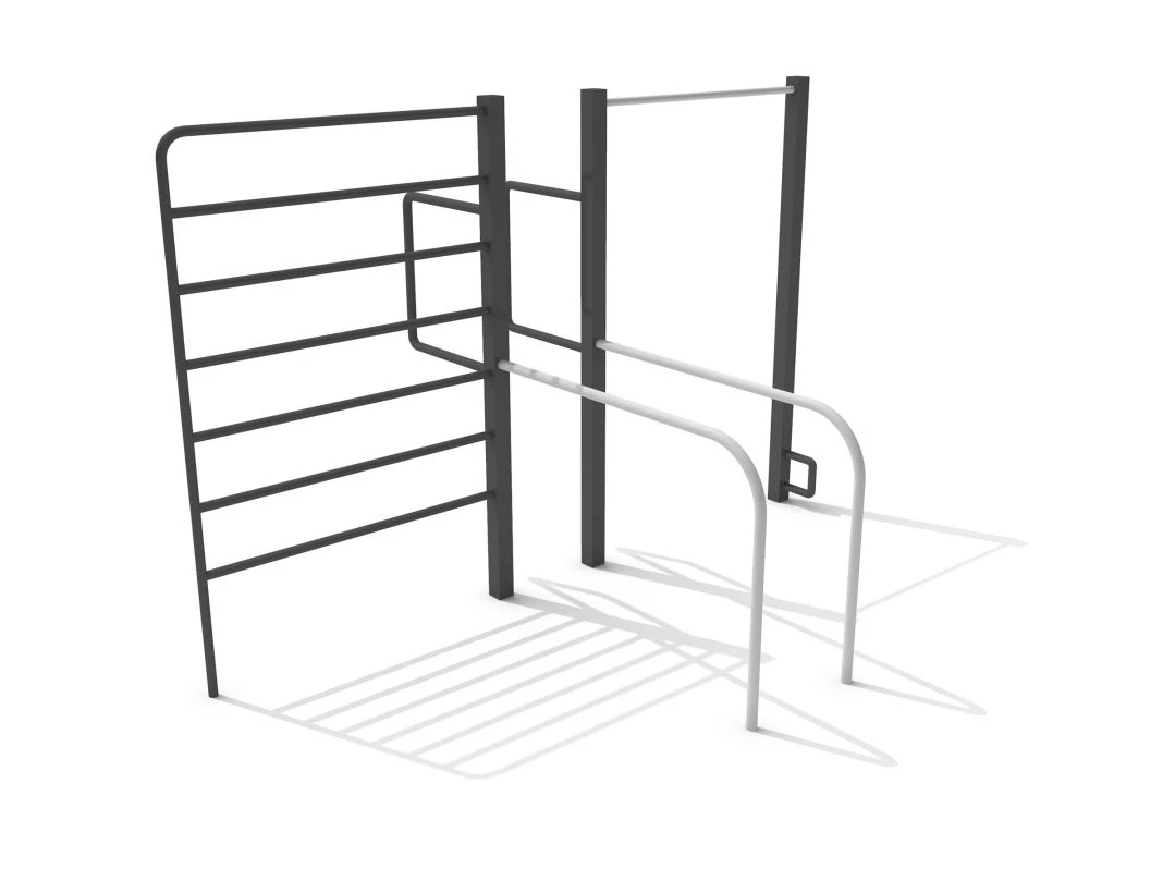 Das Outdoor Street Workout Gerät besteht aus korrosionsbeständigem Stahl und ist pulverbeschichtet. Die Konstruktionsstangen mit quadratischem Profil 80 x 80 mm und einer Wandstärke von 3 mm sind miteinander verschraubt und mit Polymerstopfen gesichert. Die Outdoor Street Workout Geräte werden alle in einem Fundament einbetoniert.