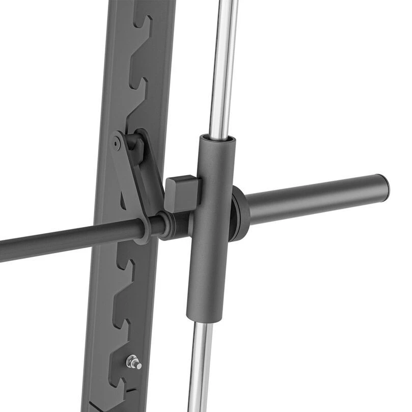 Die solide Smith-Machine ist für ein sicheres Langhanteltraining ideal geeignet. Von Bankdrücken, über Kniebeugen, bis hin zu Wadenheben können verschiedenste Übungen daran geführt ausgeübt werden. Die solide Konstruktion und hochwertige Verarbeitung gewährleisten einen sicheren Stand, auch bei hoher Belastung. Vier Hantelscheibenhalterungen mit einem Durchmesser von 50 mm dienen zur Aufbewahrung von nicht verwendeten Gewichtsscheiben und Zubehör.